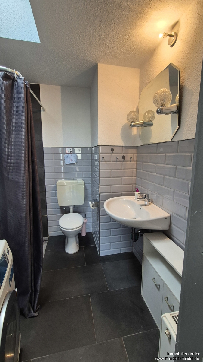 Een trap met vloerbedekking leidt naar het kleine appartement. De hal leidt direct naar de badkamer met douche, wc, wastafel en ruimte voor een wasmachine. De ruime keuken biedt ruimte voor een zithoek. De woon/slaapkamer met toegang tot het balkon creëert extra ruimte. De kamers zijn voorzien van vloeren met houteffect en de deuren zijn grijs.