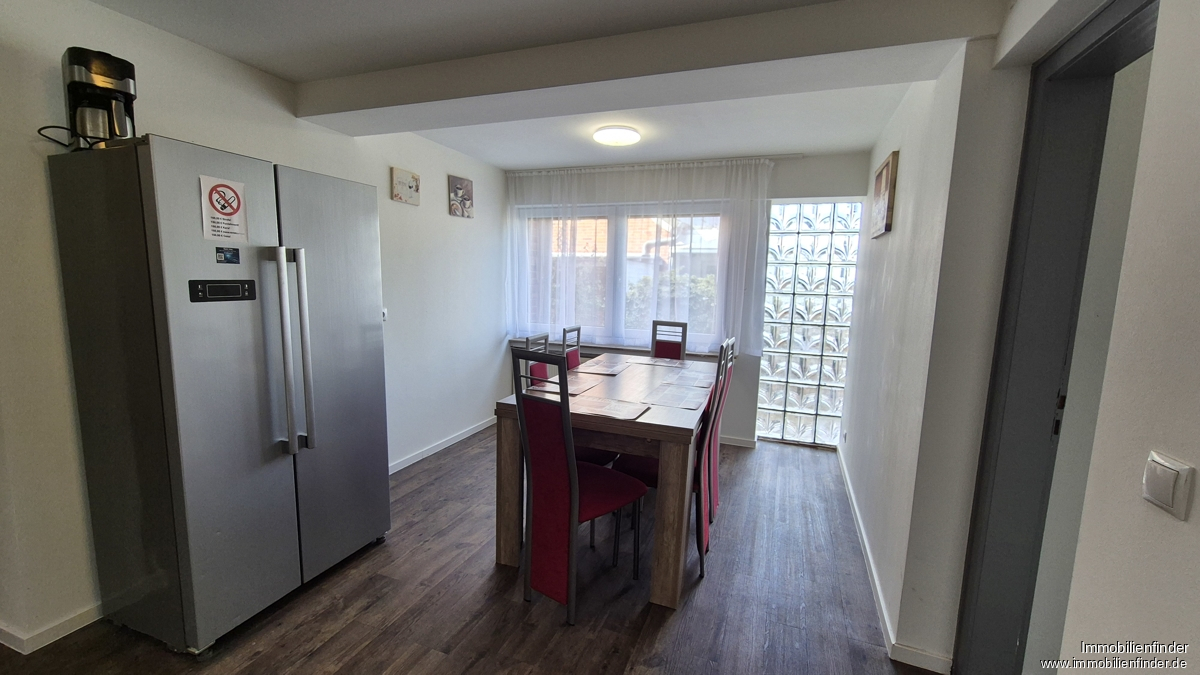 De flat is toegankelijk via de hoofdingang of de zij-ingang. Vanuit de hal leidt een deur naar de hoofdgang, waar zich een lichte kamer, een garderobe en nog een kamer bevinden. De ruime keuken biedt ruimte voor een kitchenette, een grote eethoek en een aparte koelkast. Een deur verbindt het keukengedeelte met de zij-ingang, vanwaar een kleine badkamer met wasmachineaansluiting, de kelder en een verdere kamer met een doorgang naar een andere woonkamer of slaapkamer toegankelijk zijn. Vanaf hier heb je toegang tot het terras en de tuin.